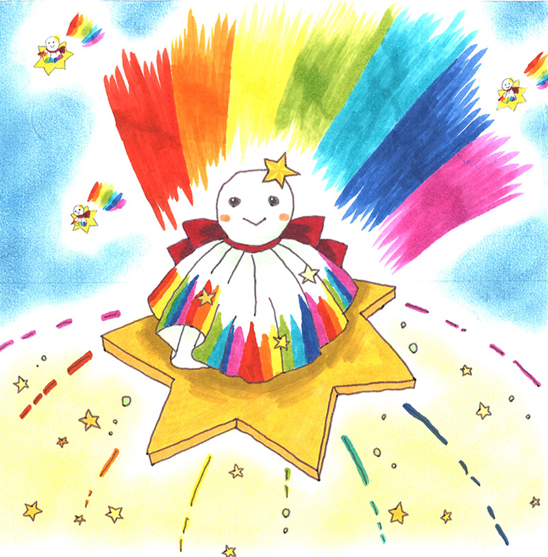 レインボーてるてるぼっしー☆ 特別賞 学校名がっこうめい・学年がくねん 金沢大学付属小学校 6年 お名前なまえ 大慈彌律おおじみりつ さん 特徴とくちょう・性格せいかく 地球上に生まれた生命、全てに祝福の星を降らせる、レインボーてるてるぼっしー☆ 宇宙の彼方から、ほうき星に乗ってやって来る。 皆の未来が明るく晴れますように…!!という願いを込めた、宇宙からの祝福。 作品一覧にもどる